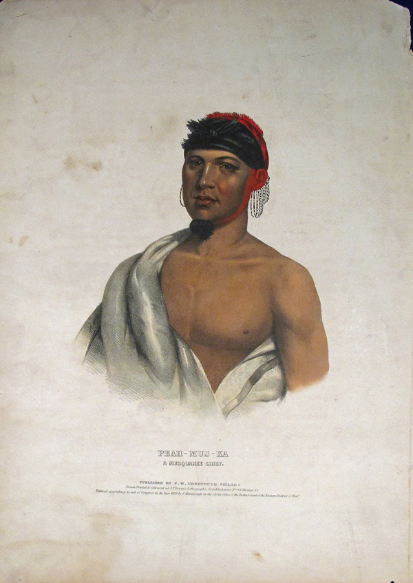 PEAH-MUS-KA A Musquakee Chief Charles Bird King (1785-1862) Lithograph, circa 1838 Paper size approx: 21 x 15 1/2 Condition: Good Framed $1000 INQUIRE